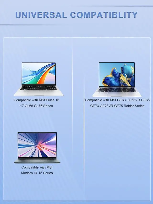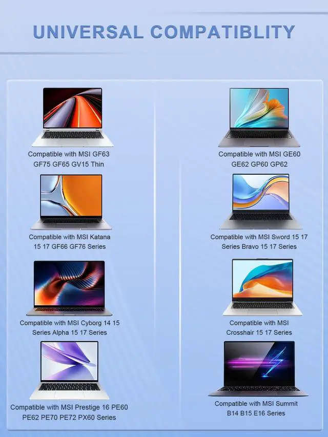 Compatible with Msi GF63 Thin 10UC 10UD 10SC 10SCS 10SCX 10SCSR 10SCXR 11UD 11UC 11SC 11UCX 9SC 9RC 9RCX 9SCX 9SCXR 9SCSR 8SC 8RC 8RD 8RCS (8th 9th 10th 11th Gen); Thin GF63 12U 12UC 12UCX 12UDX 12V 12VE 12VF 12HW (12th Gen); GV15 Thin 11S 11SC 11SCV (11th Gen); GF75 Thin 10UC 10UD 10UE 10UCK 10UEK 10SD 10SC 10SE 10SDK 10SDR 10SCX 10SCS 10SEK 10SER 10SCXR 10SCSK 10SCSR 10SCXK 10SCSXR 9SD 9SE 9RC 9SC 9RCX 9SCX 9SCSK 9SCSR 9SCXK 9SCXR 8SC 8RC 8RD 8RCS (8th 9th 10th Gen) Cyborg 14 A13U A13Ux A13UDX A13UCX A13Vx A13VF; Cyborg 15 A12VF A12VE A12Vx A12U A12UC A12UDX A12UCX A13U A13Ux A13UC A13UDX A13UCX A13UCK A13V A13Vx A13VF A13VE A13VFK A13VEK (12th 13th Gen); Cyborg 15 AI A1VEK A1VFK