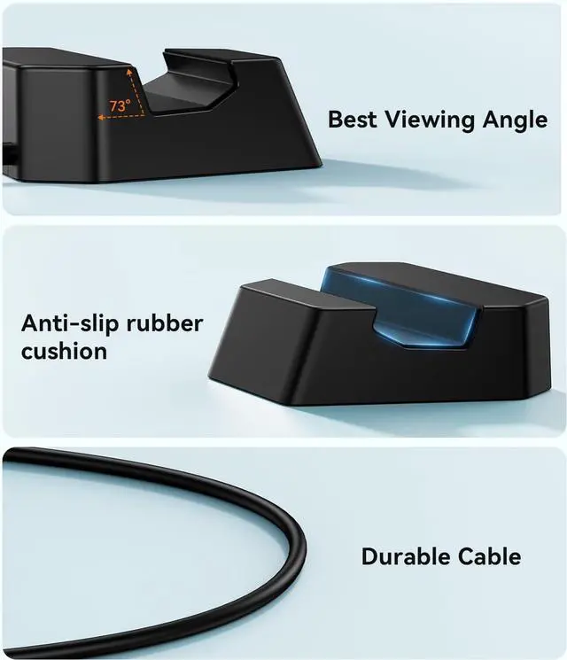 Improved Experience and Stability:This charging stand features a comfortable 45° elevation angle that offers an optimal viewing experience while playing your favorite games. The non-slip rubber pad at the bottom ensures improved stability for your game console when standing, while the soft silicone pad on the ventral surface protects against scratches.