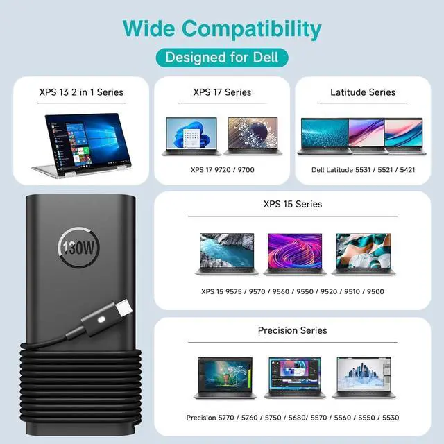 [ ] -- 130W USB C Laptop Charger for Dell XPS 15 9575 2-in-1 4K Touch-Screen Laptop Model: XPS9575-7354BLK-PUS, Dell Vostro 3458 3459 3558 5310 5410 5490 5459 5590, Dell Alienware M17 R3/Alienware X14 R1/Alienware x14 R2