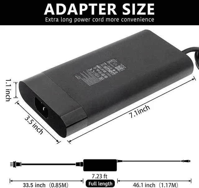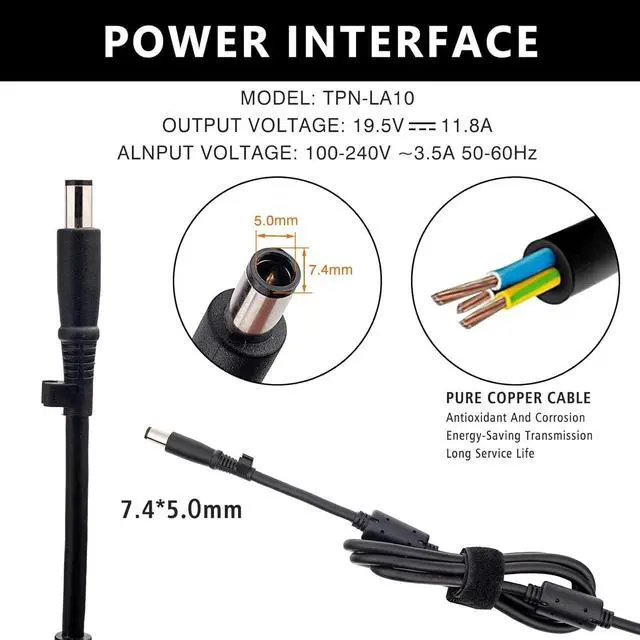Power Specifications: AC input voltage : 100 ~ 240V 50 ~ 60 Hz, DC output : 19.5V ~ 11.8A 230W, Connector size: 4.5*5.0mm Small Tip. (Work with 19.5V 10.3A 200W, 19.5V 7.7A 150W, 19.5V 6.9A 135W laptop)