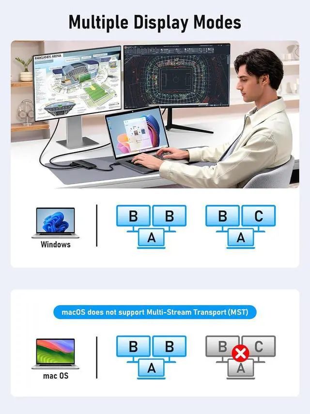 Dual Monitors Ports (4K@60Hz): Equipped with 1 HDMI port and 1 Displayport outport, this docking station supports simultaneous output to two 4K displays with a refresh rate of up to 60Hz, ensuring clear and smooth display performance, ideal for office work, multitasking, and high-definition video playback.