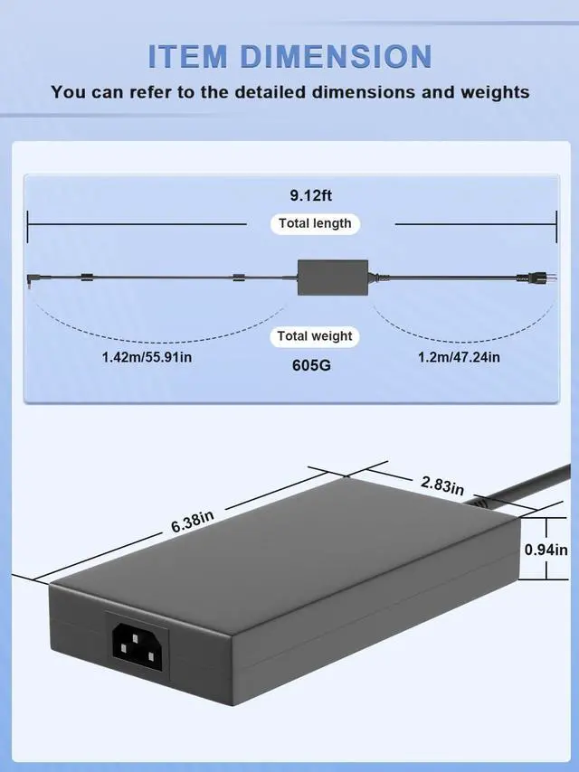 Power Specification: Output Max:19.5V 11.8A 230W Watt, (fit for 180W 135W 90W Wattage Devices) Input Volt Range: 100-240V 50-60Hz (Worldwide use). Power Jack Charging Port Connector Type: 5.5*1.7mm Barrel Connector(It is not compatible with laptops devices requiring more than 230W)