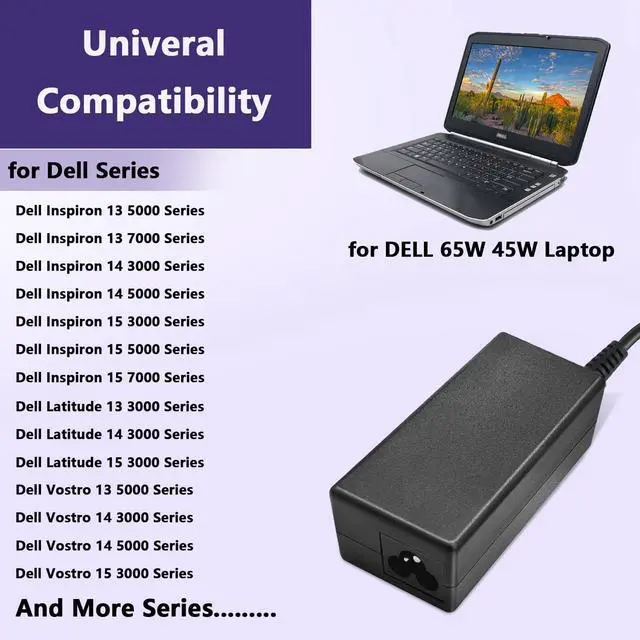 COMPATIBILITY DELL SERIESThis product has been tested and works with the following and more Dell 65W/45W Notebook PC models: Dell Inspiron 13-5000 13-7000 14-3000 14-5000 15-3000 15-5000 15-7000 Series, Dell Latitude 13-3000 14-3000 15-3000 Series, Dell Vostro 13-5000 14-3000 14-5000 15-3000 15-5000 Series.