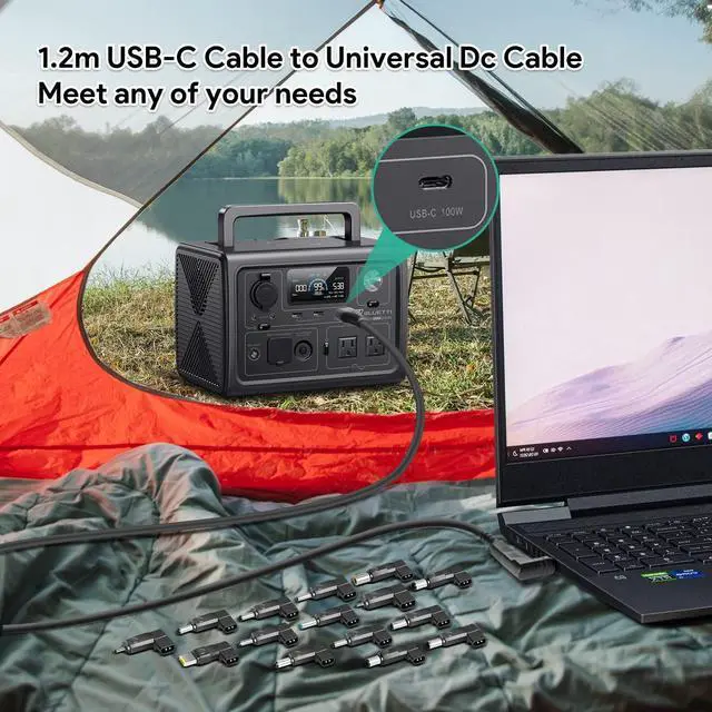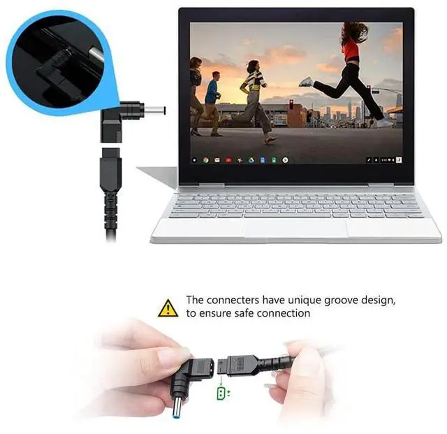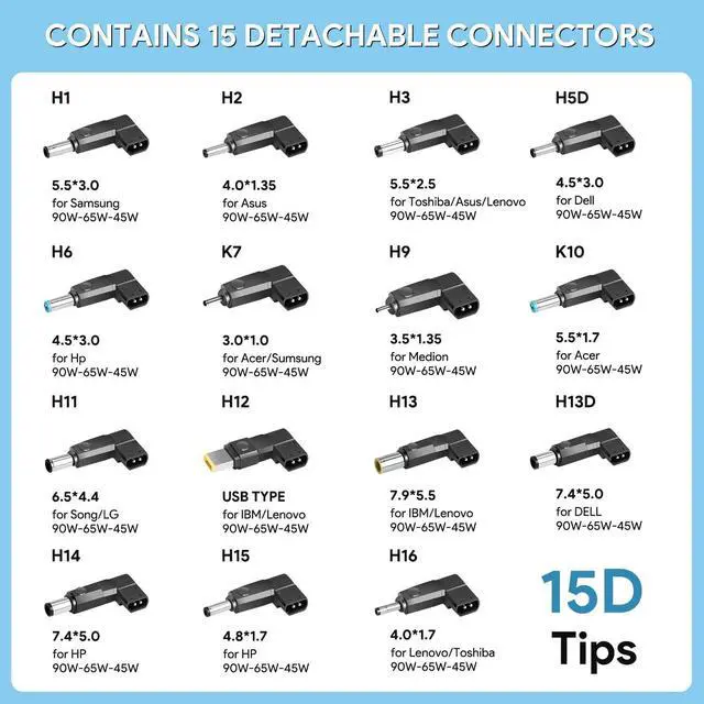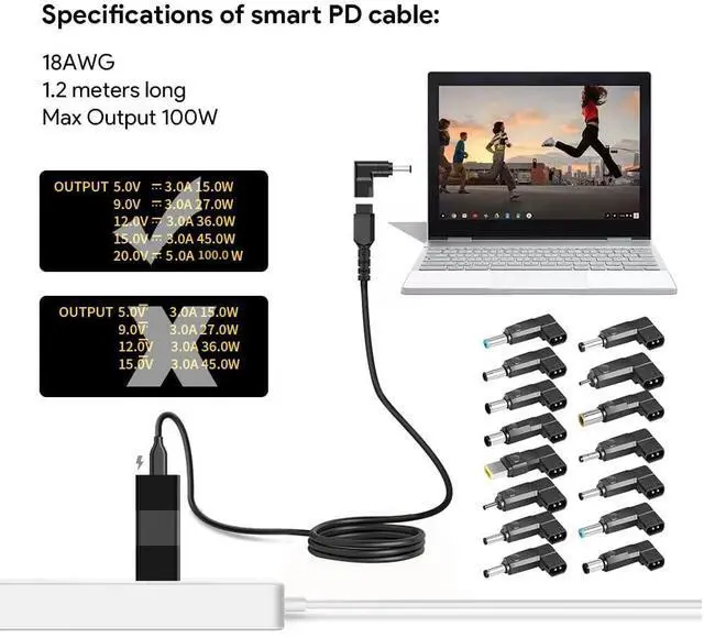 With 15 Connectors: 3.0mm*1.0mm / 3.5mm*1.35mm / 4.0mm*1.35mm / 4.0mm*1.7mm / 4.8mm*1.7mm / 4.5mm*3.0mm (for Dell) / 4.5mm*3.0mm (for HP) / 5.5mm*3.0mm / 5.5mm*1.7mm / 5.5mm*2.5mm / 7.4mm*5.0mm(for HP) / 7.4mm*5.0mm(for Dell) / 7.9*5.5mm / 6.5*4.4 mm / 11*5.0mm. Cable Length: 1.2 meters long, 18AWG. 1. Connect USB-C end to the charging source or Power Pack / Power bank / Portable Power Docking Station / Power Backup / Power Source; 2. Connect DC end with attached adapter to your laptop.
