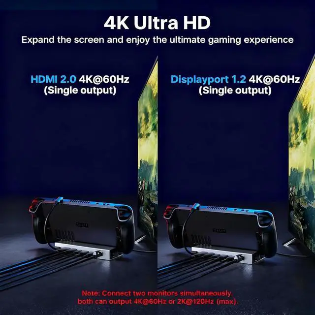 4K 60Hz UHD Equipped with HDMI 4K@60Hz and DisplayPort 4K@60Hz video outputs, this steam deck docking station instantly delivers a sharper and smoother visual experience when connected to a 4K monitor. With the easy plug-and-play feature, immerse yourself in the unprecedented visual feast during games or work.