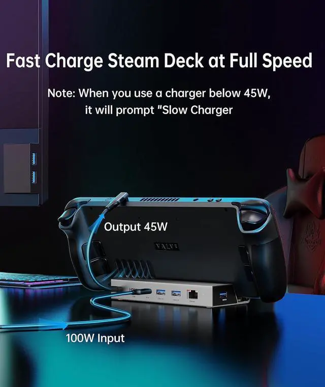 Fast ChargingTThe Legion Go Dock, a must-have among Stream Deck accessories, offers an impressive 100W power delivery that ensures quick charging for your Steam Deck, ROG Ally and Legion Go. When paired with the original charger, it charges at maximum speed. Note: The Steam Deck's top charging speed is 45W. Also, the ROG Ally Dock fully supports its 30W Turbo mode. Just remember to use a 100W charger as per guidelines for best performance with these essential game gear additions.