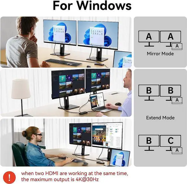 4K@60Hz USB C to Dual MonitorsThe MOKiN USB C Dock with 2 HDMI ports, allows your usb c laptops to extend 2 different monitors, Windows supports single and dual HDMI displays up to 3840x2160@30Hz or triple displays up to 1920x1080@60Hz, Mac OS (Apple laptop) & Chrome OS doesn't support extend mode.