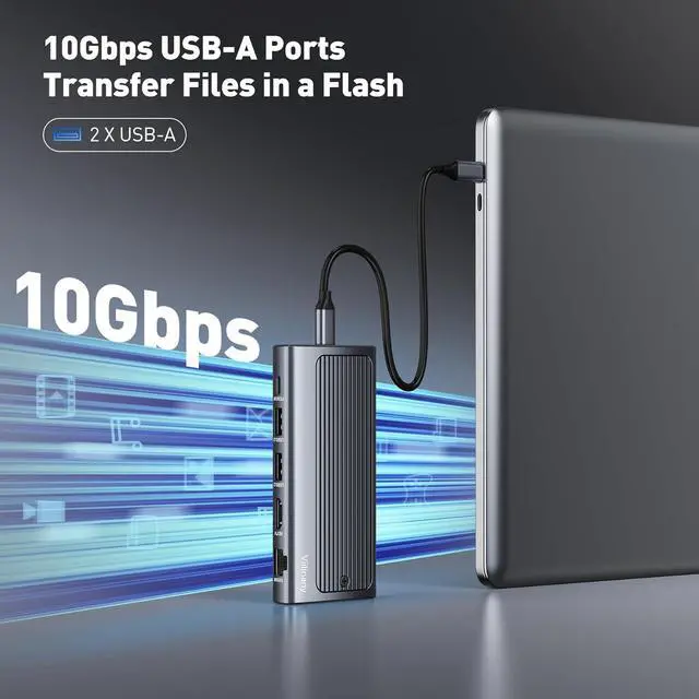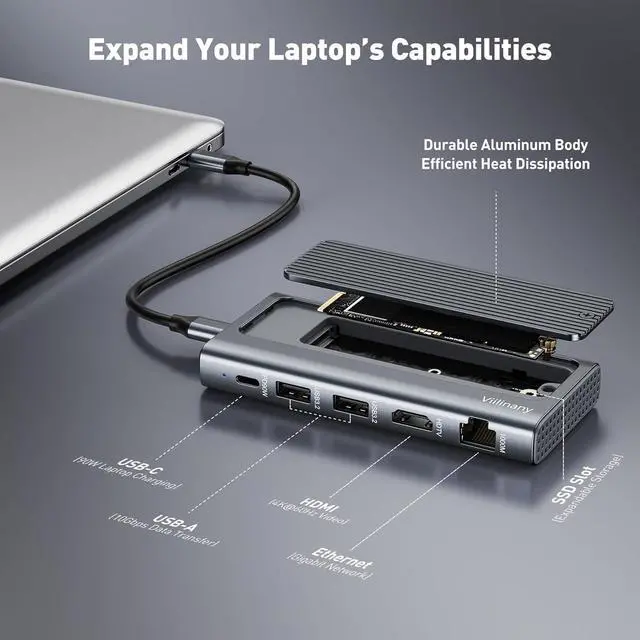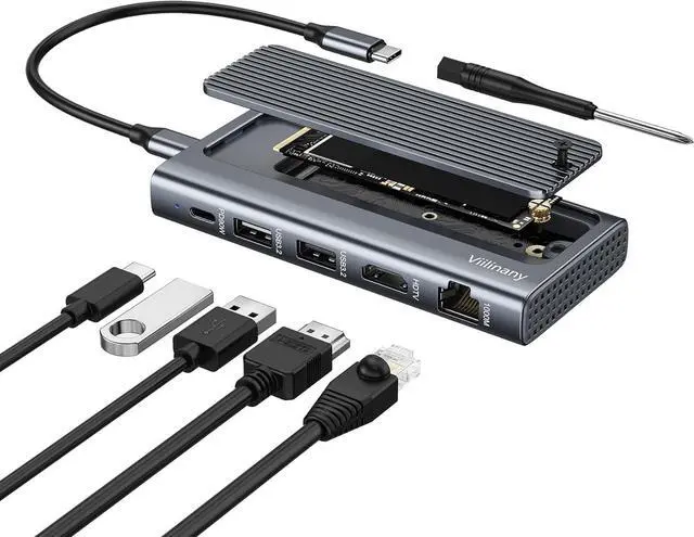 All-in-One 6-in-1 USB C Hub for Enhanced Productivity & Storage Unlock the full potential of your laptop with the Viilinany Docking Station. This hub expands a single USB-C port into a comprehensive workstation, featuring a 90W Power Delivery USB-C port for charging your laptop, a 4K@60Hz HDMI for stunning visuals, Gigabit Ethernet for rock-solid internet, and two 10Gbps USB-A ports for fast data transfer. The standout feature is the built-in 10Gbps M.2 NVMe/SATA SSD enclosure with a aluminum alloy cover, offering instant, high-speed expandable storage without any extra cables or accessories.
