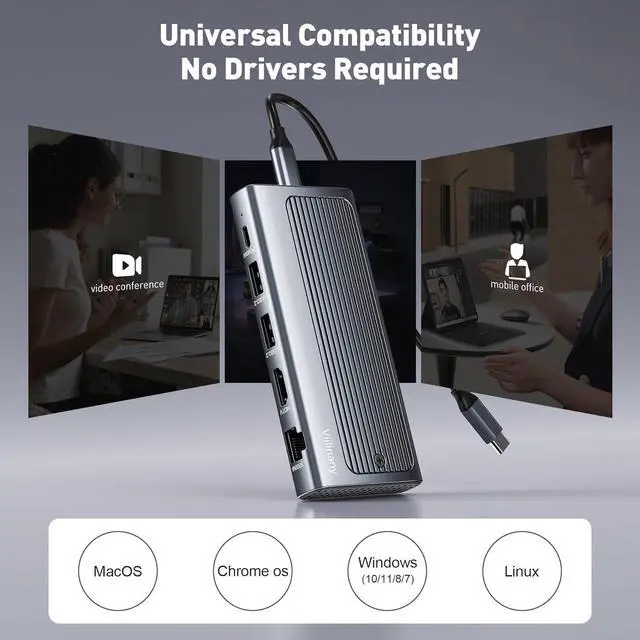 Wide Compatibility & Durable Aluminum BuildEnjoy seamless connectivity across a wide range of devices. This docking station offers true convenience with most USB-C laptops, including models from major brands, and is fully compatible with macOS Linux and Windows systemsno drivers required. Crafted from a single block of aluminum alloy, its sleek shell not only elevates your workspace aesthetics but also provides superior heat dissipation and enduring durability for years of reliable use.