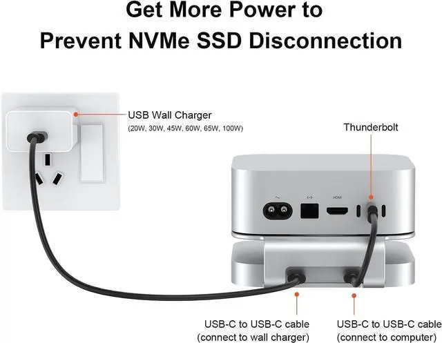 Additional USB-C for Power Supply: It has a USB-C port on the rear panel for connecting a USB wall charger for more power and to prevent the NVMe SSD from disconnecting while in use.