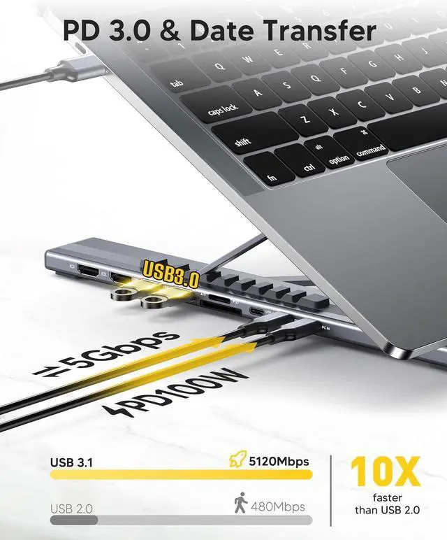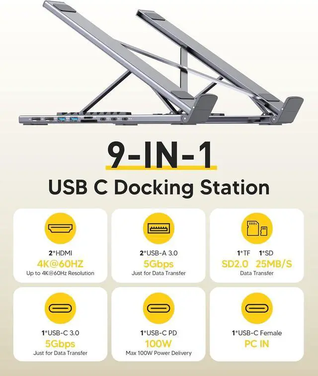 USB C Docking Station Stand: Our Upgraded lightweight and foldable laptop stand safely supports laptops from 10-17 inches and features 9 integrated ports for all your connectivity needs. USB C docking station for USB C macOS and Windows laptops is equipped with 2 * 4K@60Hz HDMI, 2*USB 3.0(up to 5Gbps), 1*USB C PD 3.0 port, and 1*USB-C 3.0(up to 5Gbps), 1*SD, 1*TF, a host port to connect the laptop. The USB C dock stands perfectly combine the function of a USB C dock and a laptop stand, making it the best choice for your USB C laptop with more features and possibilities. Ensure that your laptops USB-C port supports PD Power Delivery, DP Alt Mode and Data Transfer. )