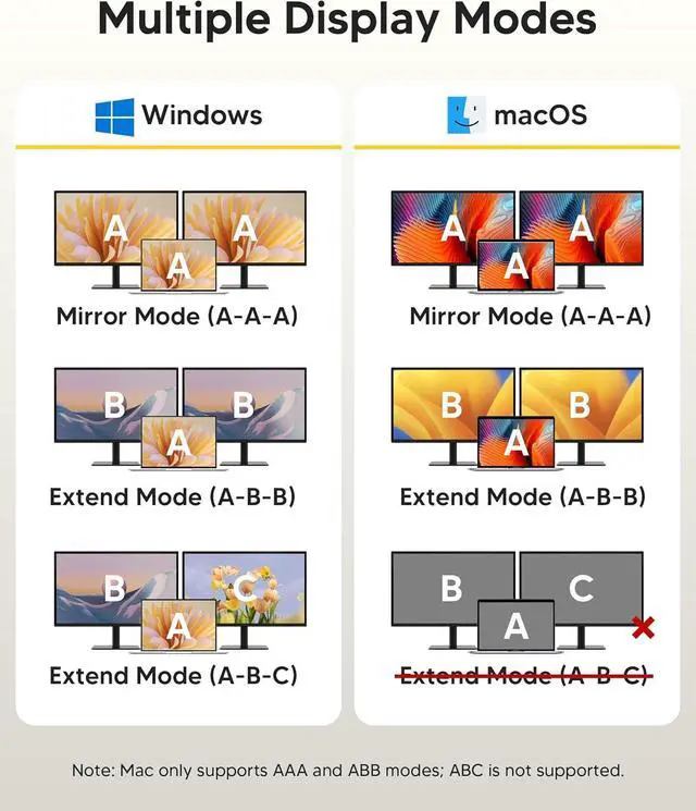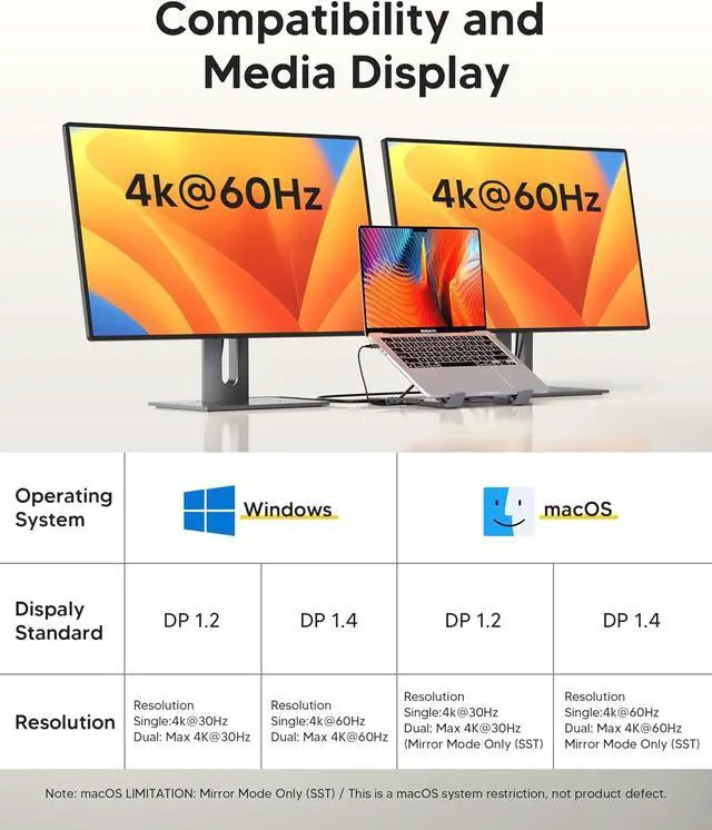 Universal Compatibility: Our plug-and-play docking station with 2 HDMI ports is compatible with a wide range of USB 3.2 Gen2 or Thunderbolt 3/4 or above laptops. Compatible with MacBook (macOS 9.1 and newer), Windows 10, Linux 2.4 and newer, ChromeOS. Full Dual Display Expansion Mode (MST) requires Windows support for DP1.4. macOS LIMITATION: Mirror Mode Only (SST) / This is a macOS system restriction, not product defect.