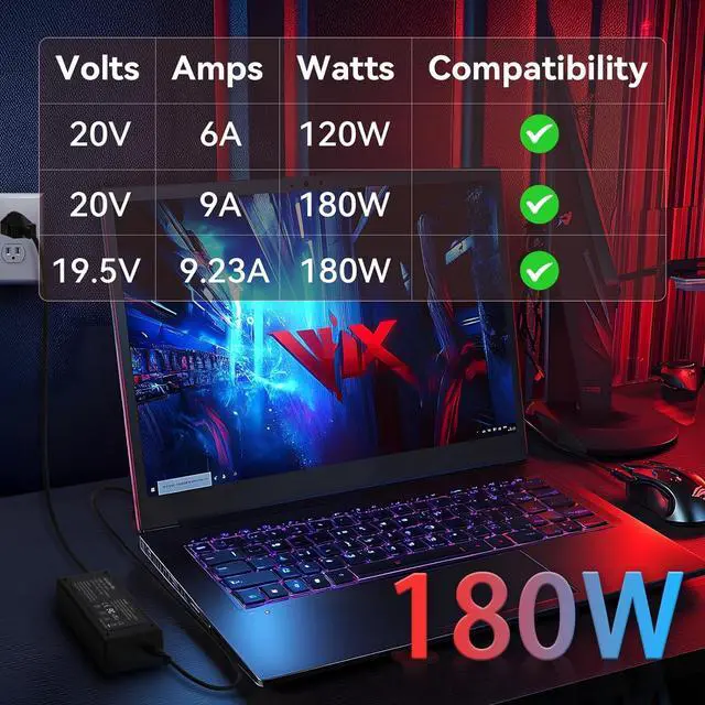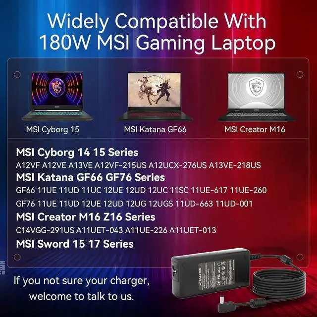 FOR MSI GAMING LAPTOP CHARGERThe output parameter of our laptop charger is 20V 9A 180W, compatible with 20V 6A 120W power supply for msi gaming laptop, the interface size of the product is 4.5X3.0mm. (Please refer to the picture to comfirm your connector size before purchase)