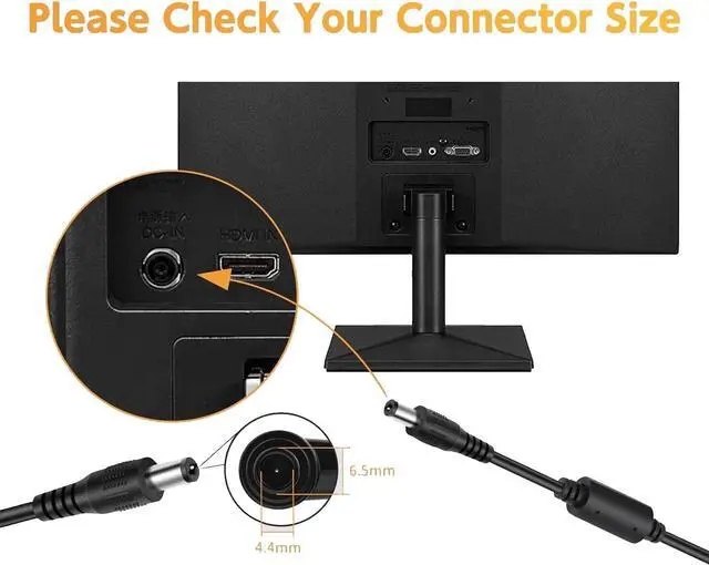 Input: AC 100-240V . Output: 19V/2.1A/ 40W. Connector size:6.5*4.4 Pay attention to the DC tip size, this 19V charger is not fit for all LG monitors! Please check the connector size of your device, our charger can not work for wrong connector size!