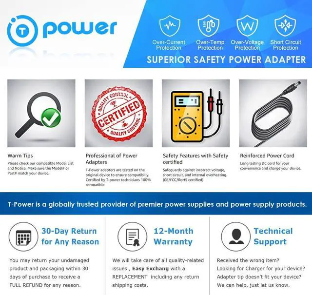 T-Power ( TM ) Made with the highest quality Brand-new Input Voltage Range: AC 100V - 240V, High-Quality Cable! This adapter has 60 days limited warranty
