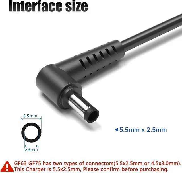 AttentionPlease Note: This 180w laptop charger is designed for GF63 and GF75 models and features a 5.5x2.5mm connector. GF63 and GF75 laptops may also use a 4.5x3.0mm connector. Please confirm your connector type before purchasing to ensure compatibility
