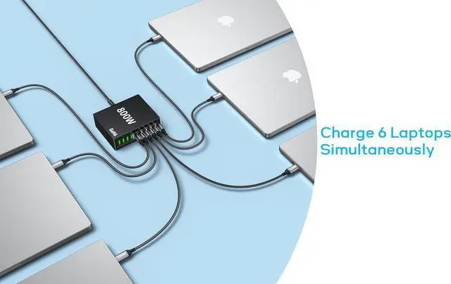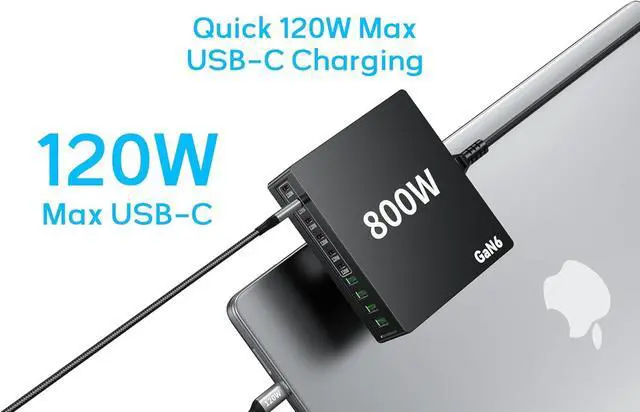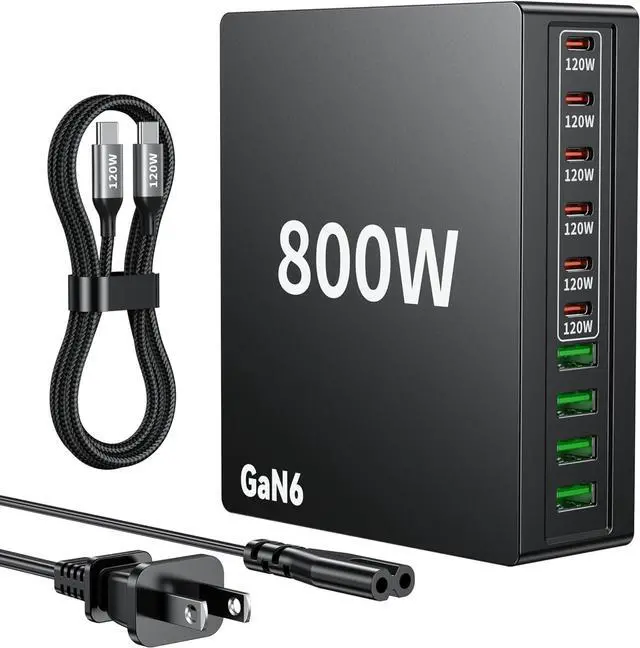 Massive 800W Total Output GaN Charging StationPowered by advanced Gallium Nitride (GaN) technology, this 10-port charger delivers a full 800W output with higher efficiency, lower heat, and a compact design. Charge all your gear simultaneously without sacrificing speed or performance.