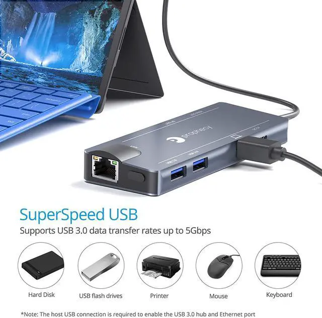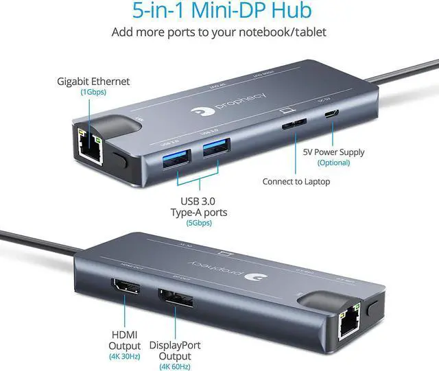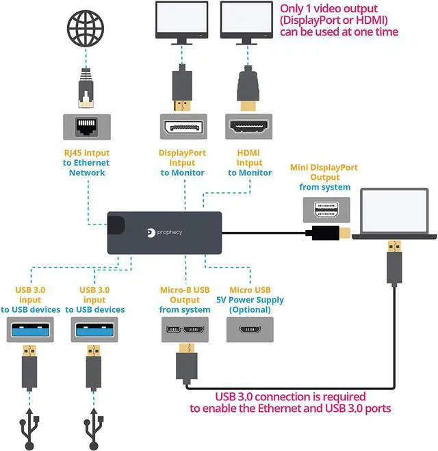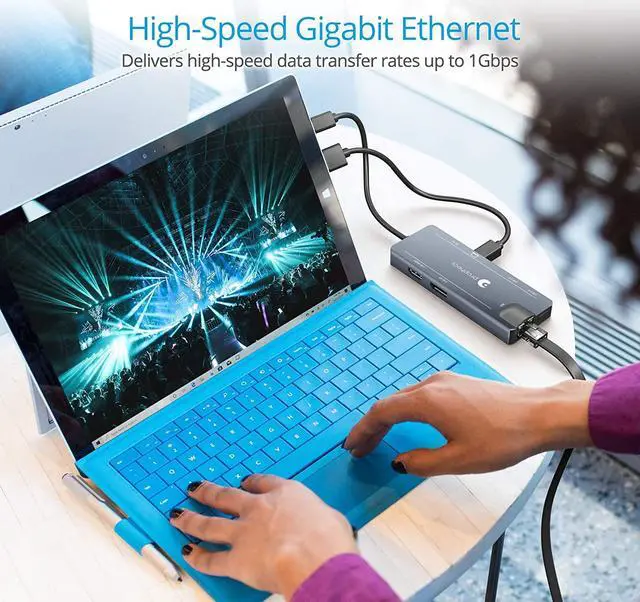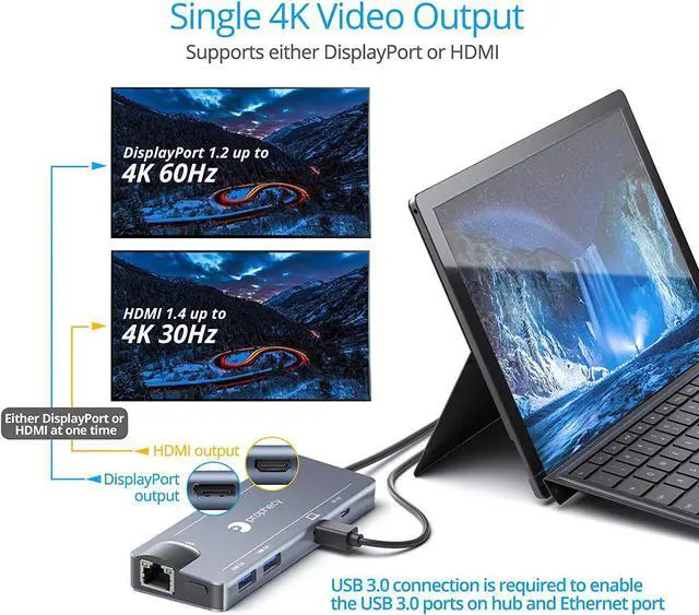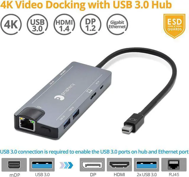 Convert your systems Mini DisplayPort v1.2 output to either DisplayPort or HDMI while adding 2 USB 3.0 ports and 1 Gigabit Ethernet port. A perfect companion for Microsoft Surface Windows tablets, laptops, and MacBooks. *Note: 1) Requires a Mini DisplayPort from the host system. 2) Mini DisplayPort version 1.2 is required to achieve 4K resolution