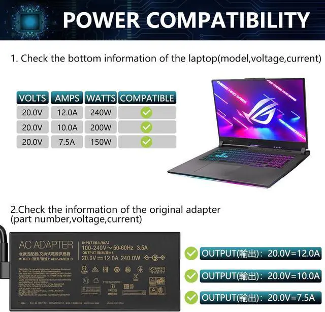 Input100-240V 50-60Hz; Output: 20V 9A 180W, NOTE: Not compatible with Asus 200w 20v 10a/ 230w 19.5v 11.8a /20v 12a 240w/ 20v 14a charger