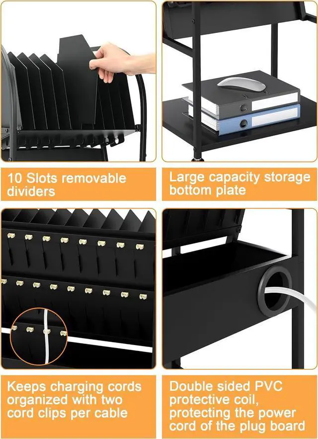 All-in-One ChargingThe Laptop charging station can charge up to 10 devices, including laptops, tablets, and Chromebooks. Laptop charging cart comes with removable dividers to accommodate different sized devices and the storage space can be customized to fit your needs