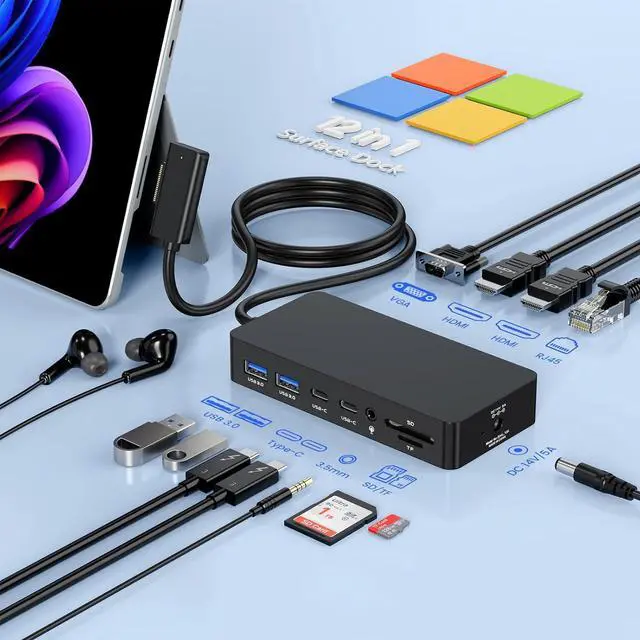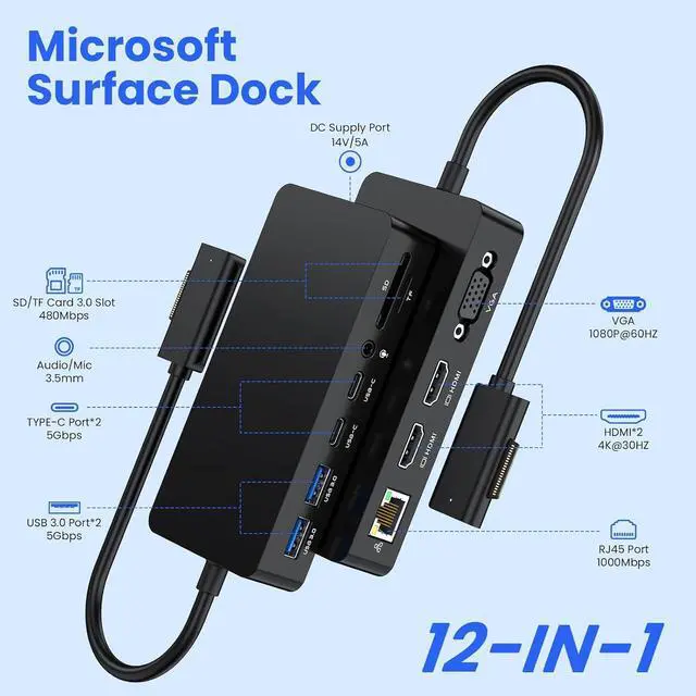 12-IN-1 Surface Docking StationSupercharge productivity with this triple-display Surface docks plug-and-play design, packing dual 4K@60Hz HDMI ports for lag-free multi-screens, 1080P@60Hz VGA for legacy devices, Gigabit RJ45 for stable internet, 2×USB-C/3.0 ports, 2TB-supporting SD/TF slots, and 96W charging. Ditch clutter and charger jugglingit turns your Surface into a workstation for remote work, creative projects, and daily multitasking.