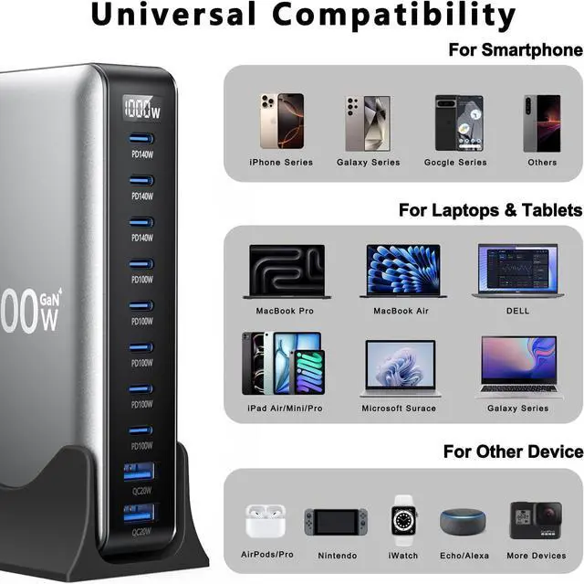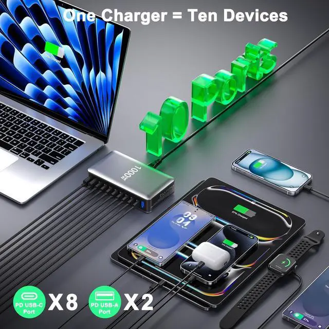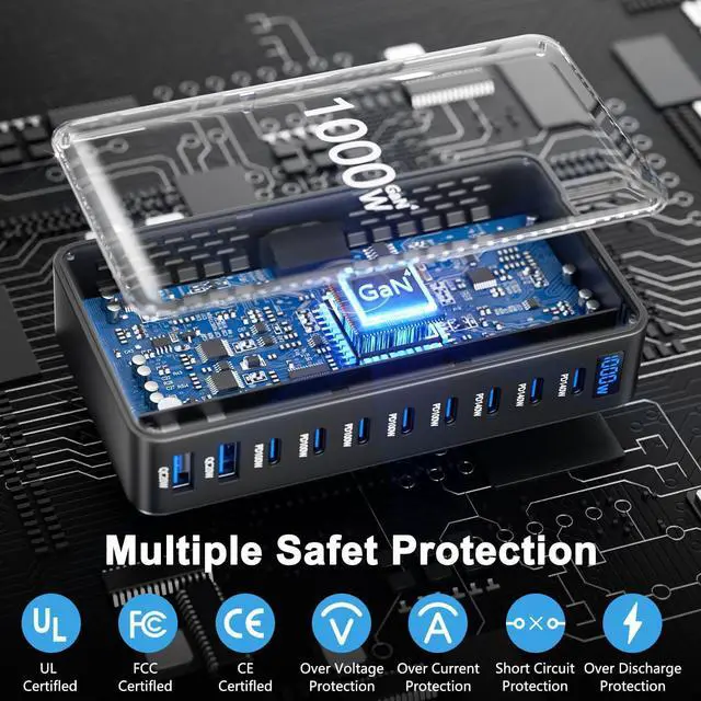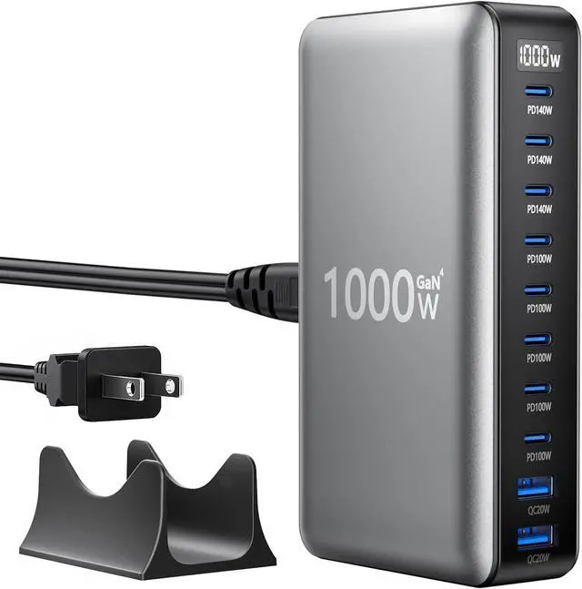 POWERFUL 1000W CHARGING STATION: Features GaN IV Pro technology with 10 ports including dual 140W PD ports, four additional 140W PD ports, two 100W PD ports, and two 20W QC ports for simultaneous charging of multiple devices
