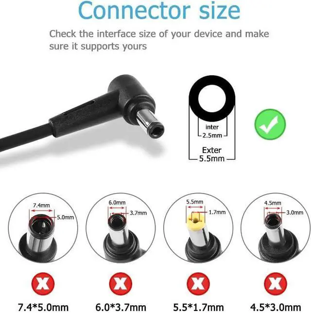 Connector Size: 5.5*2.5mm (as shown in the picture). Not comaptible with 4.5*3.0mm and 6.0*3.7mm.connector. Input: 100-240V 50-60Hz, Output: 20V 7.5A 150W.
