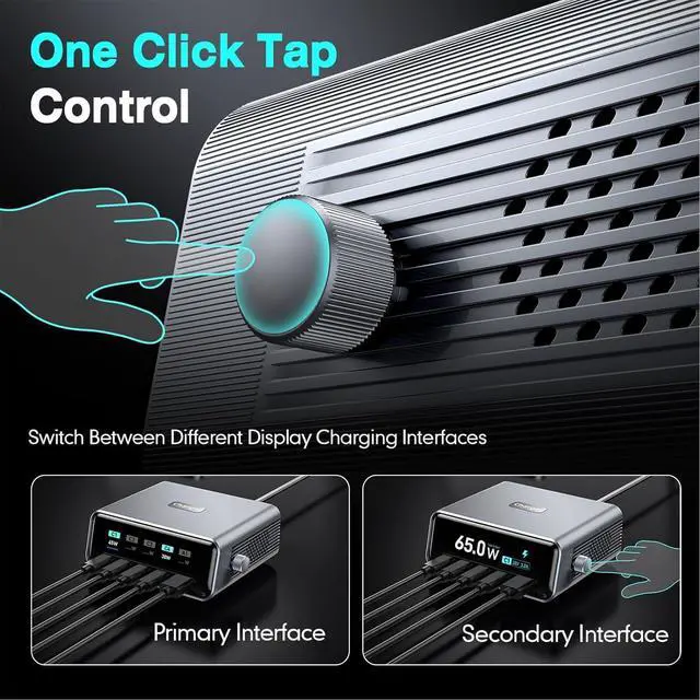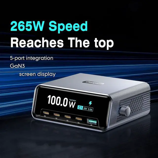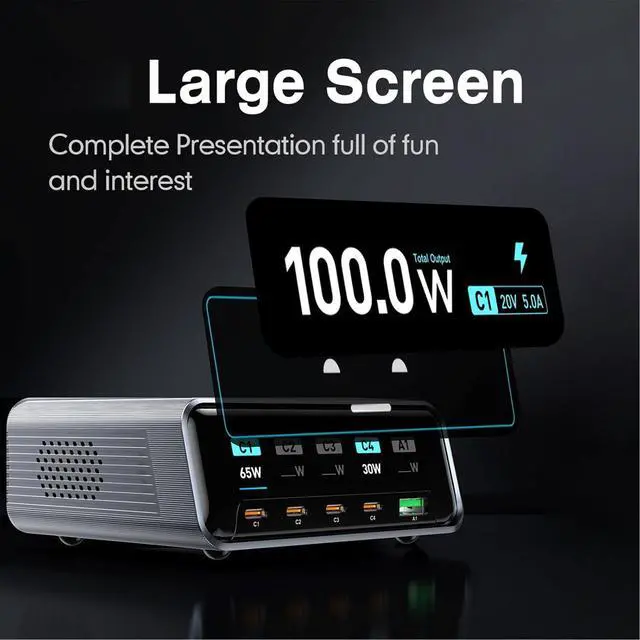 [Smart Power Display] This 265w gan fast charging station features a 2.3-inch high-definition screen that provides real-time charging data for all connected devices. instantly monitor power usage voltage and current ensuring optimal charging efficiency for your laptop phone tablet and more. the intuitive display keeps you informed so you can manage energy consumption effectively.