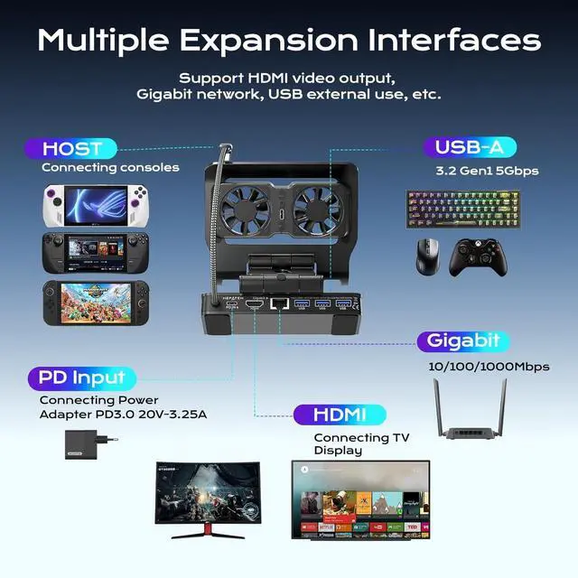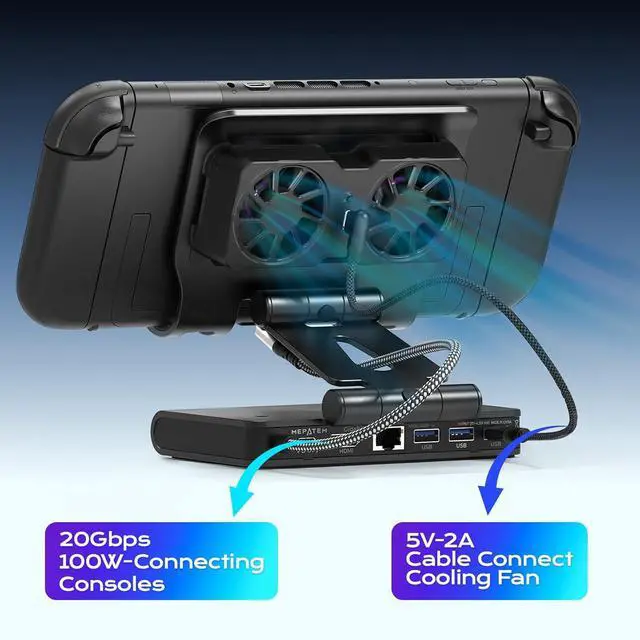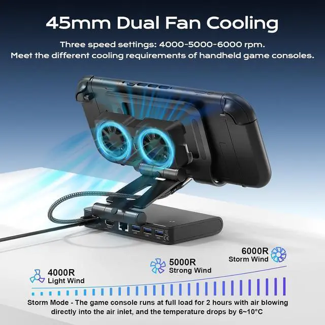 3 Speed Dual-cooling Fan: Our docking station is your ultimate gaming companion! The magnetic dual-fan design allows for easy installation and removal, and the three wind speed options can be adjusted according to your devices real-time heating status. Effectively extending the battery life of your handheld game console, say goodbye to system crashes and frame drops caused by overheating!
