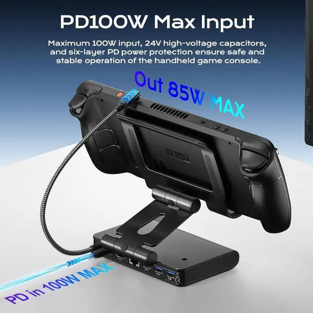 6-in-1 Docking StationAs essential steam deck accessories, this 6 in 1 charging station is a game-changer for ultimate gaming experiences! Equipped with HDMI 4K@144Hz output, it delivers stunningly smooth and clear visuals that bring games to life. The 100W PD charging keeps your handheld fully powered during extended sessions, while 3 fast USB A 3.0 ports let you connect controllers, keyboards, and more effortlessly. Plus, the 1000Mbps Gigabit Ethernet ensures lag-free online gameplayall in one compact dock that meets every gaming need.