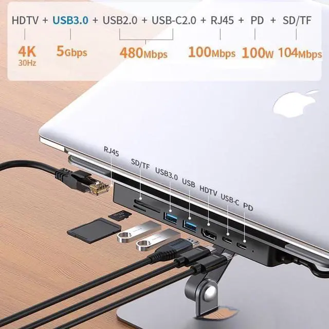 8-in-1This docking station has 8 functional ports to meet your expanding needs with a 100W PD charging port, a 4K HDMI port, 1 USB-A 3.01USB-A ,TF and SD card slots, and a USB-C host device connection portRj45. All hub ports can work at the same time, small but powerful. No driver needed