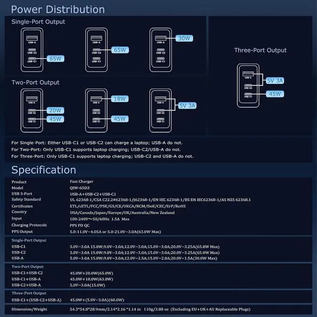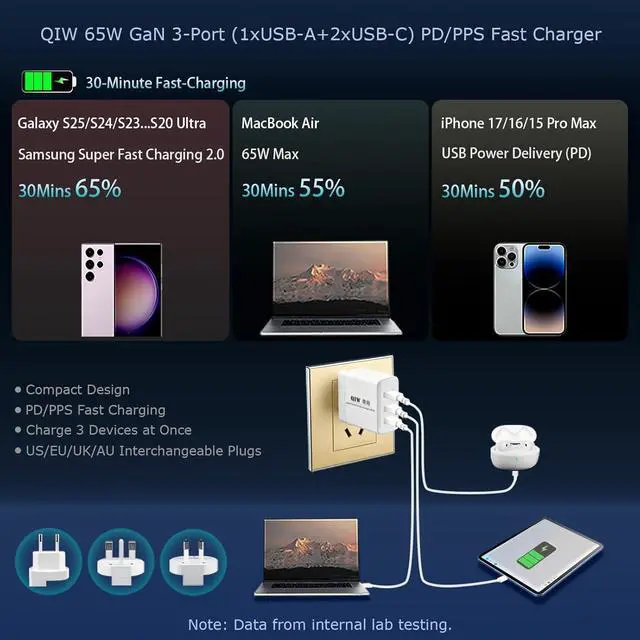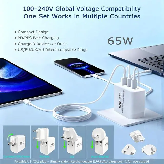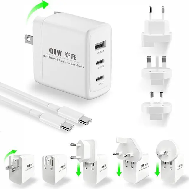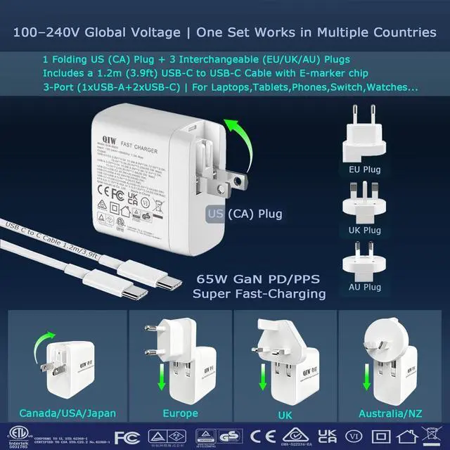 Compact & Travel Friendly: QIW 65W USB-C Wall Fast Charger. Includes a Foldable/Folding US (CA) Plug, 3 Interchangeable/Replaceable (EU/UK/AU) Plugs, International AC Power Adapter, and a 1.2 m (3.9 ft) E-marker USB Type-C to USB Type C Data Cable. Compatible with outlets in the United States, Canada, Japan, Europe, the UK, Australia, and New Zealand, its a true global solution one set covers multiple countries. Supporting worldwide universal voltage AC 100-240V, its perfect for home, office, business trip and travel use.