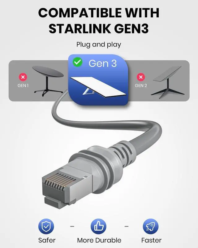 Wide-Range Compatibility Starlink Cable Gen 3This versatile Starlink cable works flawlessly with Starlink Gen 3 satellite internet systems and all RJ45-enabled devices (routers, modems, switches). Whether as a replacement or extension, this Starlink link cable ensures a stable connection across your entire Starlink setup.