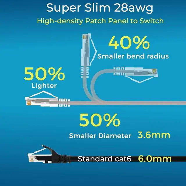 Super SlimThe 28 AWG 1 foot ethernet cable is at least 50% smaller in diameter than 24 AWG cat 6 patch cables. Makes cat 6 ethernet cable 1 ft easy to route through cable management panels.