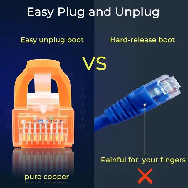 Easy UnplugPremium quality and durable network patch cable is with fully molded strain relief connections and easy unplug clip protector. Ethernet network cable meets or exceeds Category 6 performance TIA/EIA 568-C.2 standard.