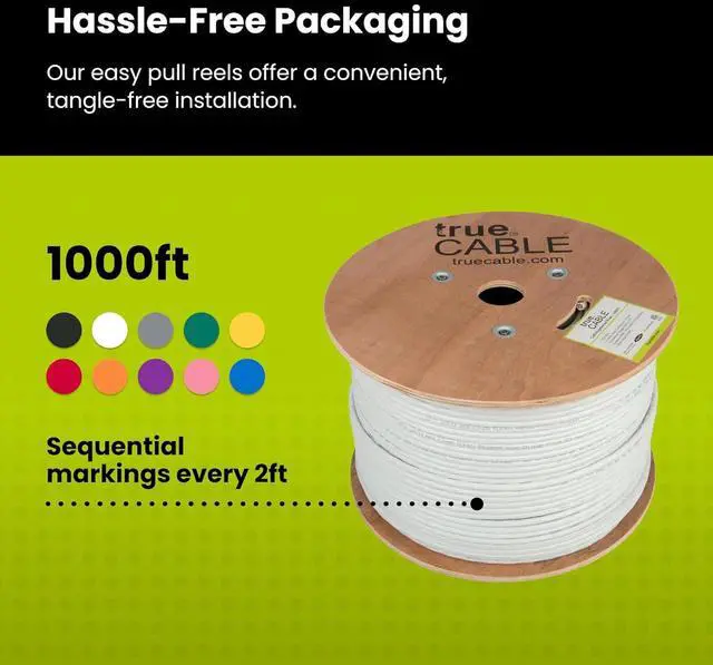 [Easy To Use] Comes on a tangle-free, easy-pull reel with sequential 2ft markings on the ethernet cable for accurate measuring. Designed for indoor use to prevent fires from spreading from floor to floor in vertical installations with mild flame retardance.