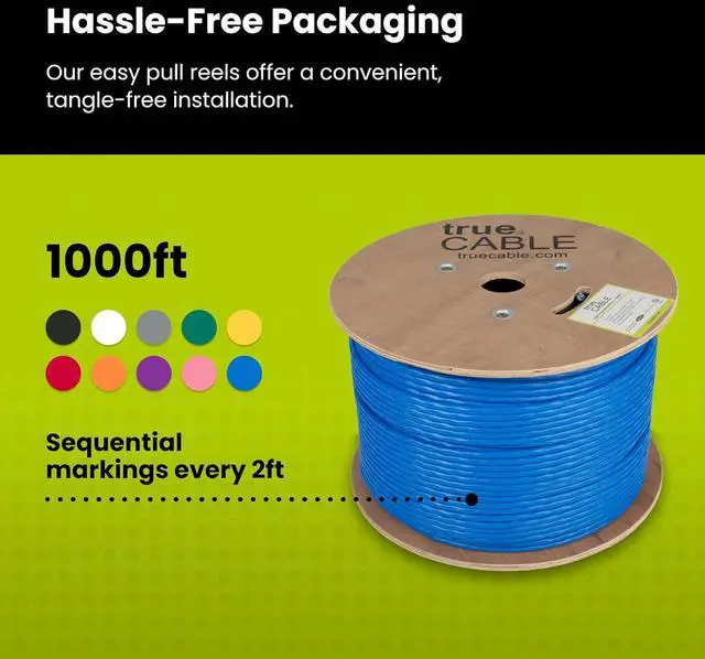 [Easy To Use] Comes on a tangle-free, easy-pull reel with sequential 2ft markings on the ethernet cable for accurate measuring. Designed for indoor use to prevent fires from spreading from floor to floor in vertical installations with mild flame retardance.