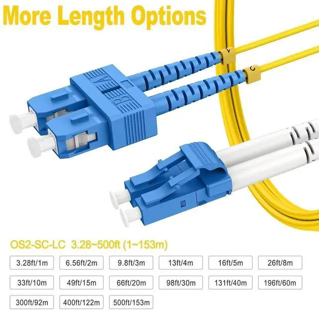 [Wide Application] This OS2 SC-LC Single Mode Duplex Fiber Patch Cord is ideal for connecting 10G SR, 40G BIDI SR, QSFP+, SFP+ transceivers etc, suitable for 1G/10G/40G/100G/400G Ethernet connections, saves more space for your high density cabling in data centers, cloud storage networks, server farms, computer room wiring, community network construction and any places fiber optic cables are necessary.