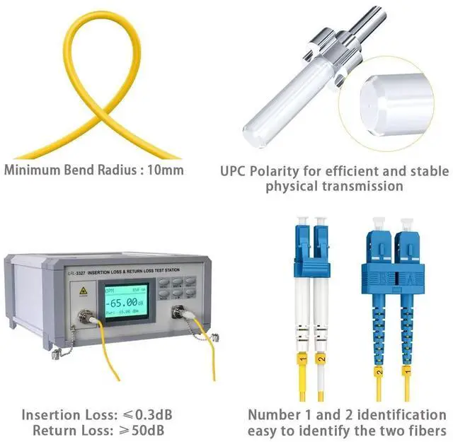 [Industry Standard] OS2 SC-LC Fiber Patch Cord is constructed with LSZH environmentally friendly Jacket. Optimum IL and RL of the Zirconia Ceramic Ferrule ensures stable signal transmission(Accordance with EIA/TIA 604-2, 100% inspected), protecting your network safety. 15mm Minimum Bend Radius improves duct utilization, enabling smaller enclosures.