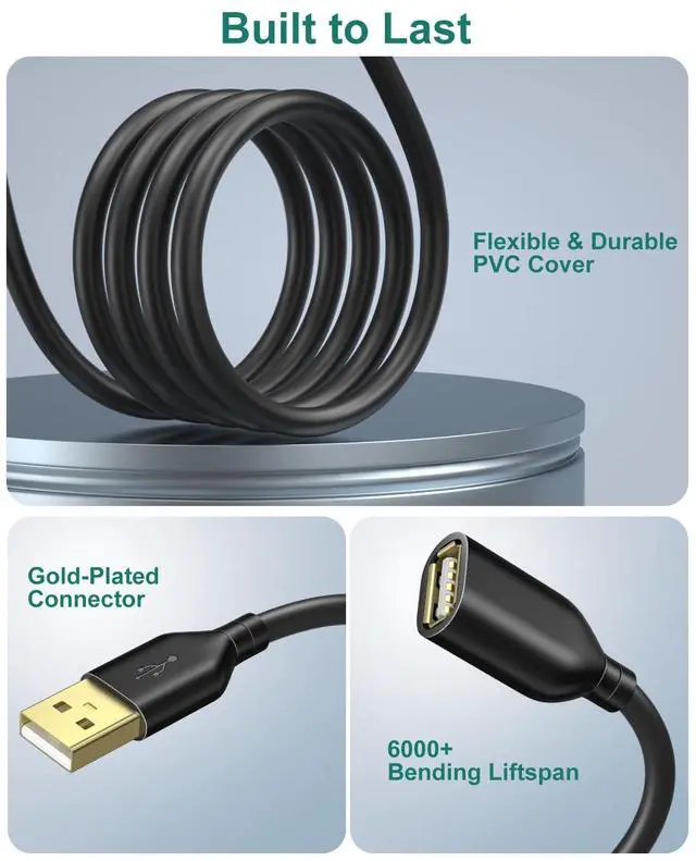 Extra Durable USB Extension Cord: Made of durable PVC material and corrosion resistant gold-plated connectors for safety and long-term usage without signal loss, providing maximum conductivity and minimize data loss. Non-toxic and ECO-Friendly material is no harm to people.