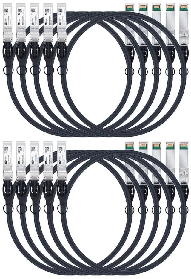 10Gb SFP+ Cable: 10G SFP+ to SFP+ DAC Twinax cable assembly support 10 Gbps data rate, 10GBASE-CU Passive, 2 meter (6.6 ft), 30 AWG; DAC Length includes 2 SFP+ connectors; 10 Pack