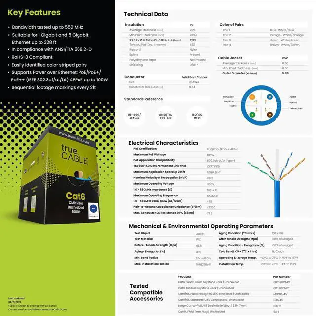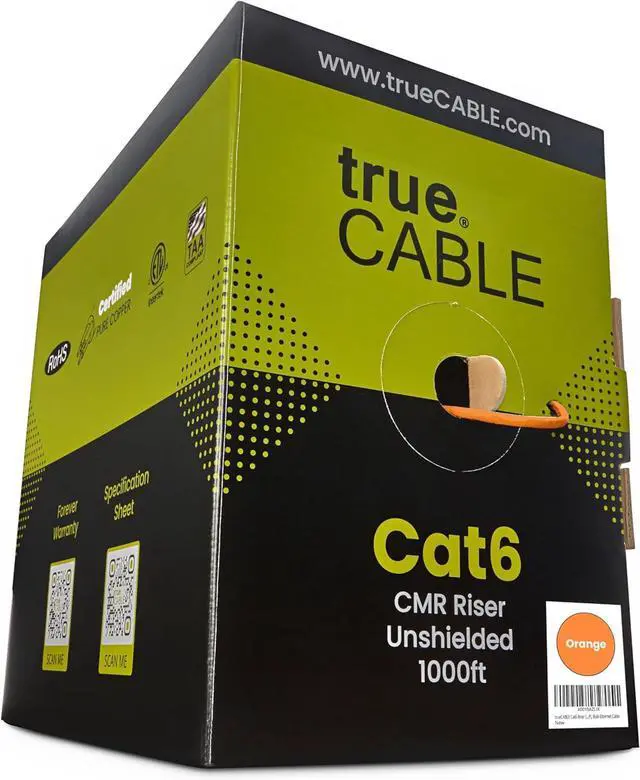 [ Certified by trueCABLE] Our data cables have been tested with a DSX-8000 Versiv CableAnalyzer and are in compliance with ANSI/TIA 568.2-D standards, RoHS-3 compliant, and cETLus certified. Backed by our FOREVER WARRANTY. Compatibility & performance tested with trueCABLE RJ45 Connectors - B07Y3DDLGW and B088KWF9CW.