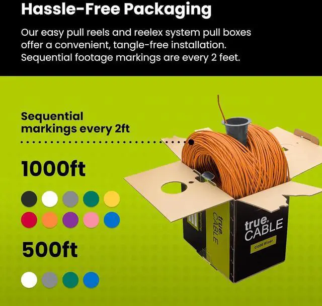 [Hassle Free Packaging] 1000 feet (305 meters) comes conveniently pre-spooled in a tangle free, easy pull box so you dont have to worry about getting behind on your next job.
