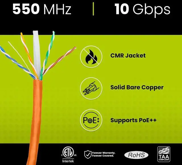 [High Performance Network Cable] This riser rated cat 6 lan cable is 23 AWG with 4 pairs (8 conductors). Suitable for 1 and 5 Gigabit speed up to 328 feet and 10 Gigabit speed up to 165ft depending on the installation environment. Bandwidth tested up to 550 MHz. Supports Power over Ethernet: PoE/PoE+/PoE++ (IEEE 802.3af/at/bt) 4PPoE up to 100W.