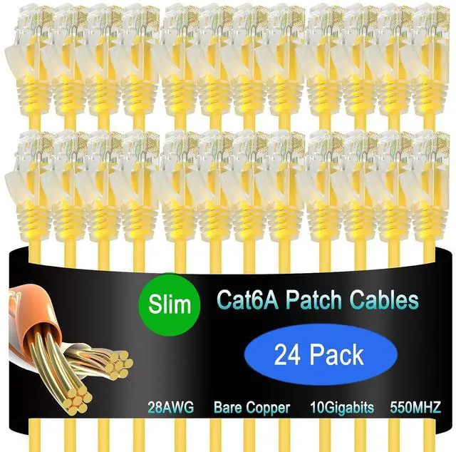 Cat6a Slim Ethernet Patch Cable 3 ft (24 Pack), Cat6a Patch Cable for Data Centers, Cat 6 Patch Cable 10G, Network Patch Cables for Home and Enterprise Network -Yellow