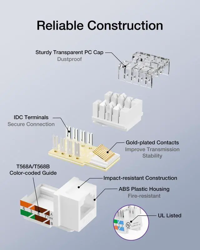 Package Content: 25 x Cat6 90-degree keystone jack. With UL Listed (E521847, C265-6/UL) and worry-free 18-month warranty, just use it without concern.