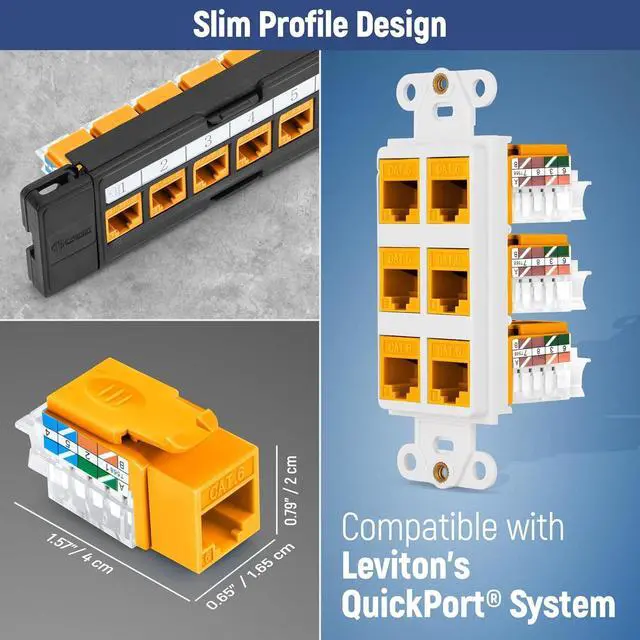 • Slim Profile Design - Can be used with a patch panel, wall plate, or surface mount box with standard or slim keystone blank openings. Cat 6 keystone jack accepts 23 and 24 AWG unShielded twisted pair (UTP) cable. compatible with Leviton QuickPort System and slim Cat6 Decora style wall plates