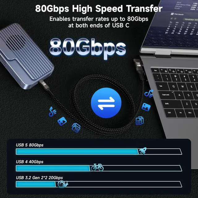 80Gbps Groundbreaking Ultra-Fast Data Transfer Enables bidirectional ultra-high-speed transmission, allowing instant transfer of large files with exceptional efficiency. This USB5 right-angle cable not only delivers powerful performance but also is compatible with Thunderbolt 5 Cable, ensuring zero signal loss and stable connectivity during high-performance tasksletting you experience future-ready speed and reliability ahead of time.