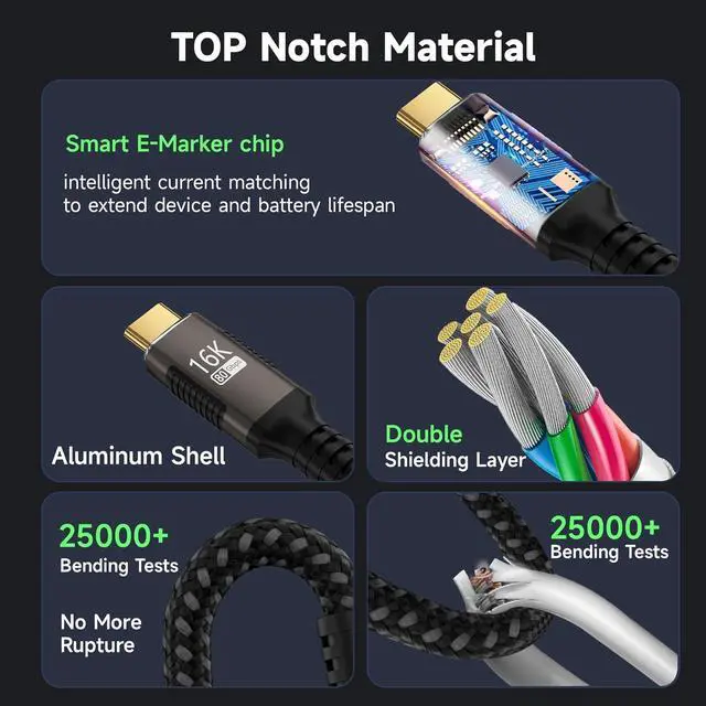 E-marker Chip Protection This USB5 cable right angle features an E-marker chip that intelligently adjusts output voltage and current, effectively shielding devices from damage caused by overheating or short circuits. Crafted with upgraded nylon braiding, it has endured over 25,000 bending tests, boasting enhanced resistance to abrasion and tearing for exceptional durability. As a USB5 standard-compliant cable, it also supports the Thunderbolt 5 protocol, seamlessly meeting higher-specification transmission and charging requirements.