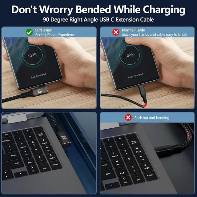 90° Right-Angle Design: Durability & Daily Convenience Ditch port damage from bulky straight connectors with this usb c male to female extension cablefeaturing a precision-engineered 90° L-shaped connector that makes it the ideal usb c extension cable right angle (also called right angle usb c extension or usb c right angle extension). It minimizes mechanical stress on device ports to extend cable and device lifespan, while maintaining full-speed charging. The low-profile design eliminates tangles and awkward positioning, perfect for gaming, streaming, or reading with your usb c right angle extension.